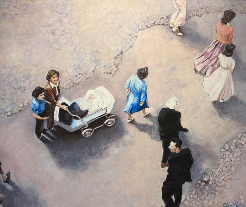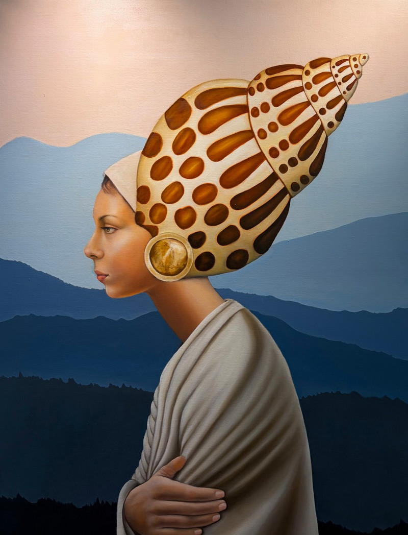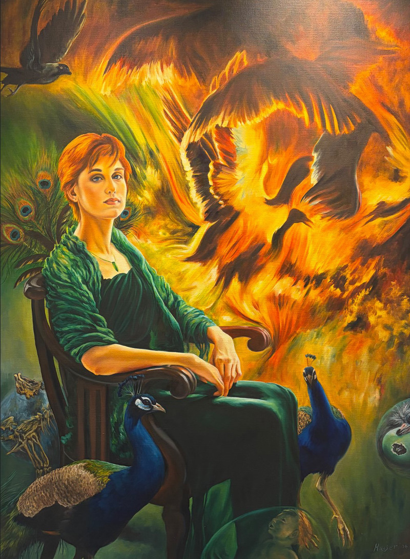 Iris Hauser is a figurative painter who has committed herself to the subject for more than four decades. Her oil paintings combine high realism, in the tradition of the old masters, with allegory and symbolism to achieve a self-conscious, contemporary take on surrealism. Despite the realistic rendering of the figures and forms in her paintings, there is an unmistakable artificiality to Hauser’s scenes; these are not snapshots of every-day life, but intentionally composed tableaux with symbolic and allegorical heft.
