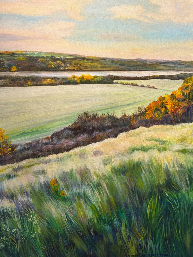 As a Landscape painter, I have walked and painted in many locations across the prairies. It is hard to define what is a typical prairie scene, as it is quite varied and can be as extreme in colour and texture as the weather. What you think is flat can fall away revealing a river valley or an estuary teaming with life and foliage. If it is not happening at ground level, look to the sky.